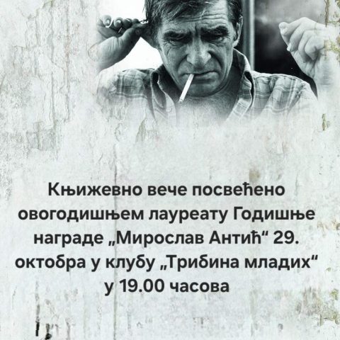 Књижевно вече посвећено овогодишњем лауреату Годишње награде „Мирослав Антић“ 29. октобра у клубу „Трибина младих“