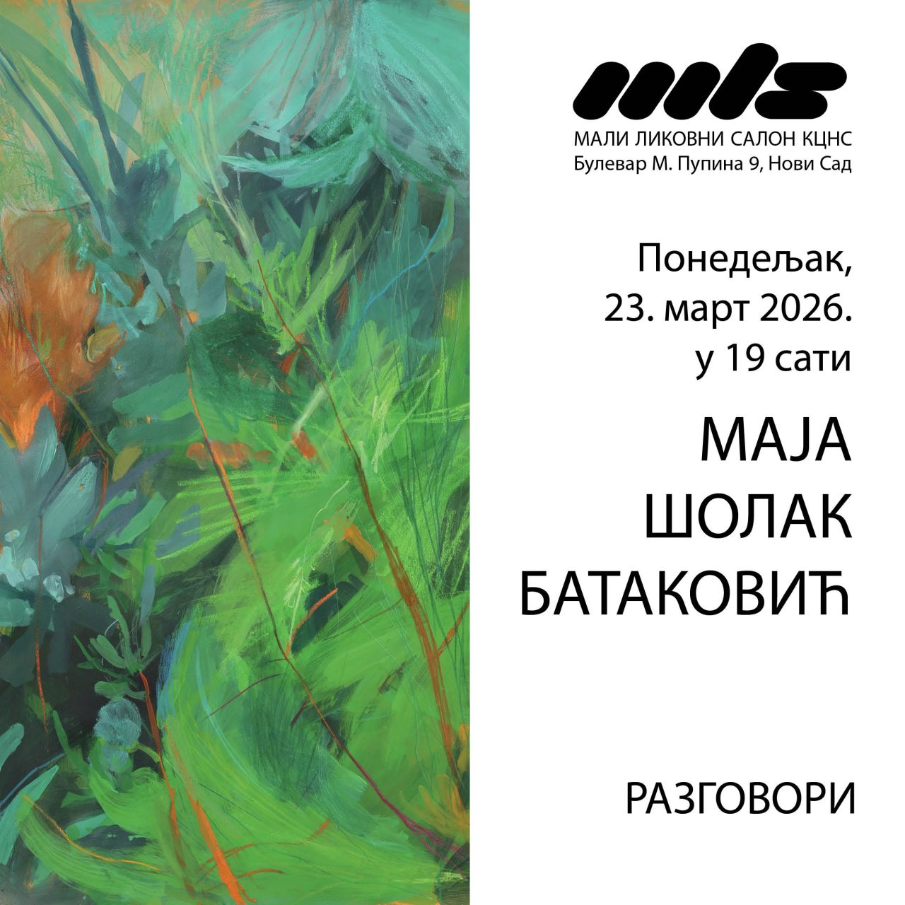 Изложба Маје Шолак Батаковић „Разговори“ биће отворена у понедељак 23. марта у 19.00 часова у Малом ликовном салону. Изложба ће моћи да се погледа до 9. априла.