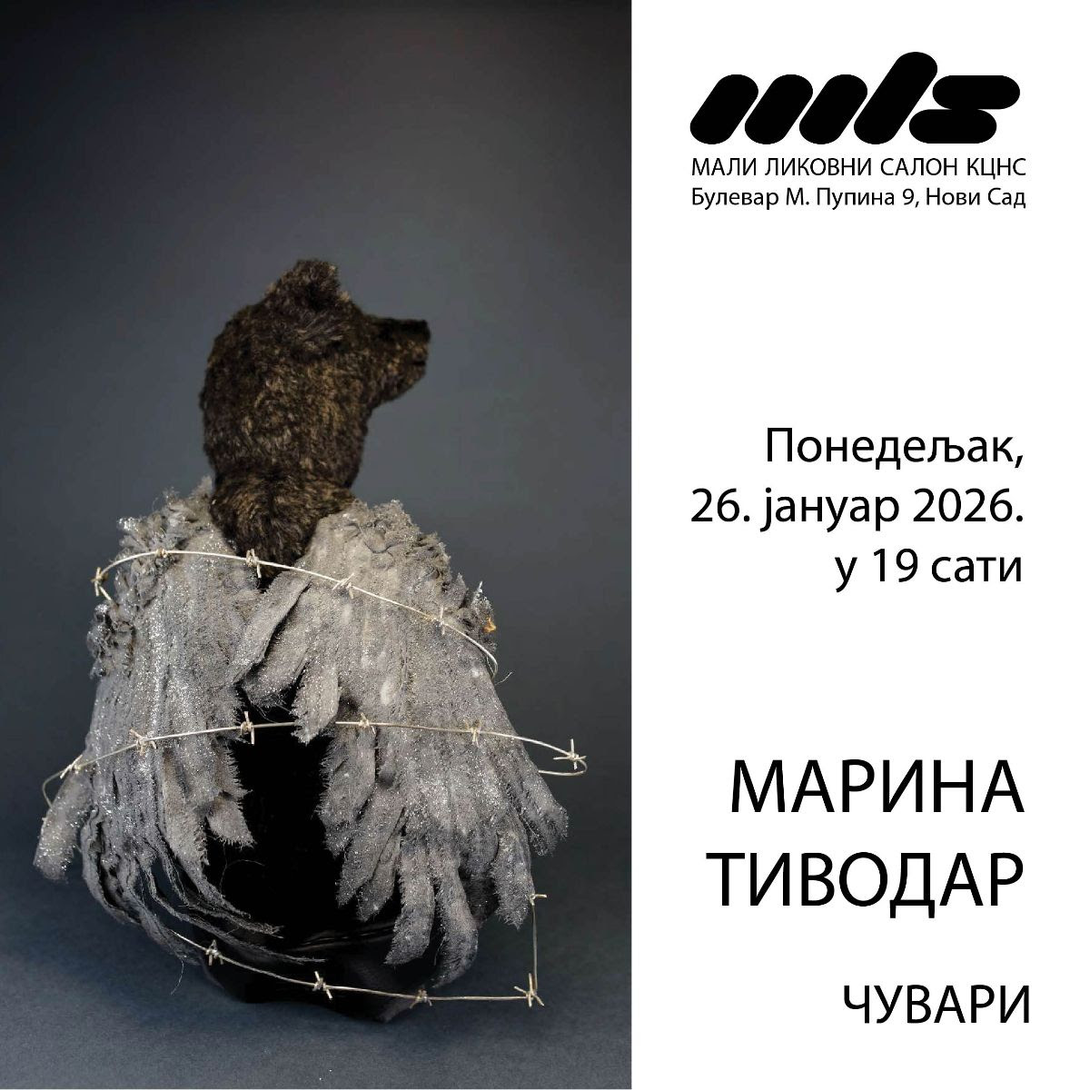 Изложба Марине Тиводар „Чувари“ биће отворена у понедељак 26. јануара у 19.00 часова у Малом ликовном салону. Изложба ће моћи да се погледа до 6. фебруара.