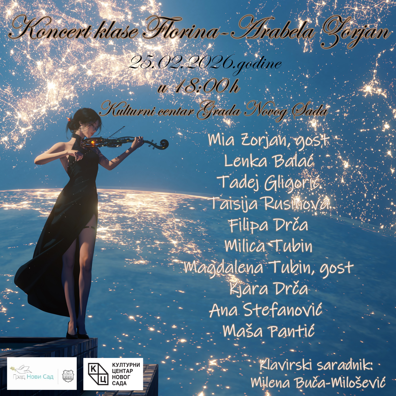 У оквиру програма музичке редакције Културног центра Новога Сада биће одржан концерт класе Флорине-Арабеле Зорјан. Концерт ће се одржати у среду, 25. фебруара 2026. године у 18 часова, у клубу “Трибина младих”.