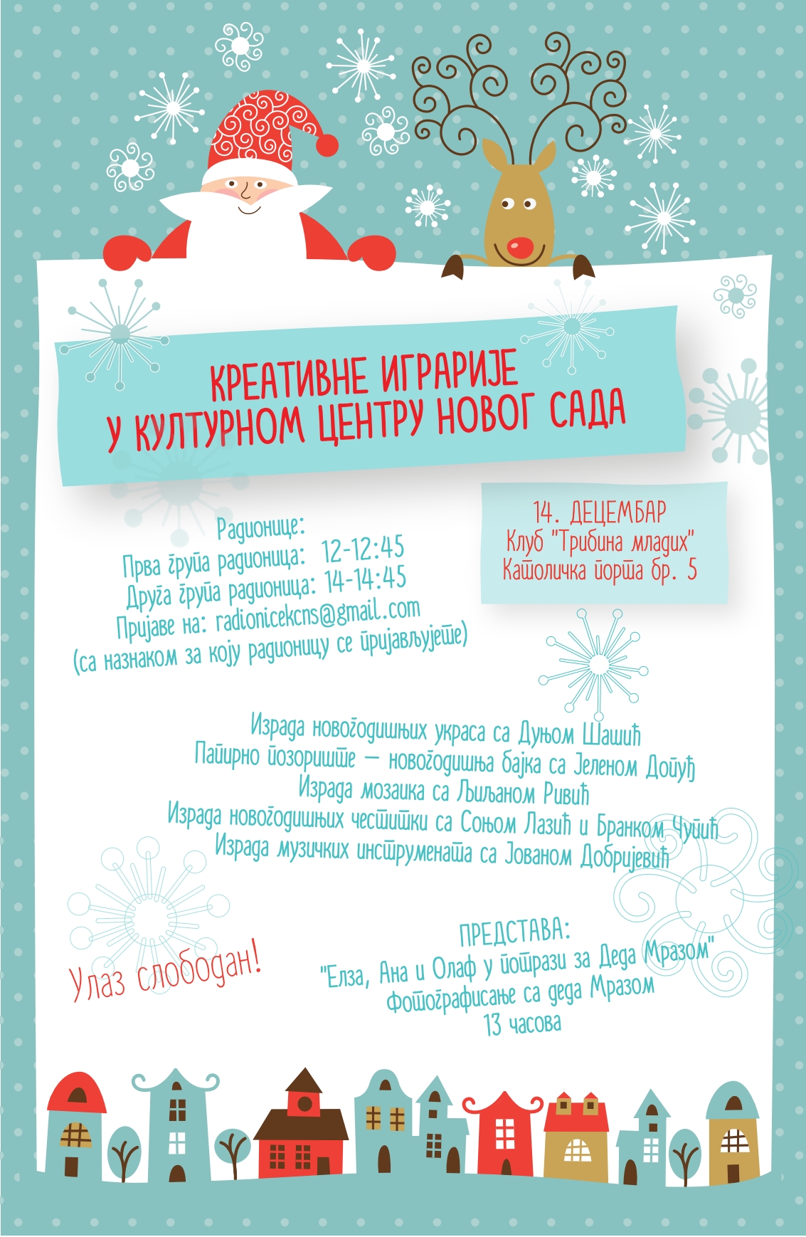 Овај мали креативни дан употпуниће и представа „Елза, Ана и Олаф у потрази за Деда Мразом“, која ће почети тачно у 13 часова на истом месту. Малишани ће након представе имати прилику да се фотографишу са Деда Мразом. Улаз за представу је слободан, али је број места органичен.