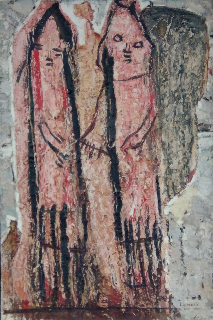 Цветко Лаиновић је био и остао препознатљив по „бијелим сликама“, и оне чине један део ове поставке. То су симболичне слике редукованог, брзог цртежа, али линеарног ритма, који се губи у белини текстуре. Духовну и профану тематику – Мојсија, Христоса, женске ликове – Лаиновић је представљао изненађујуће једноставним, префињеним потезима на грубој површини слике.