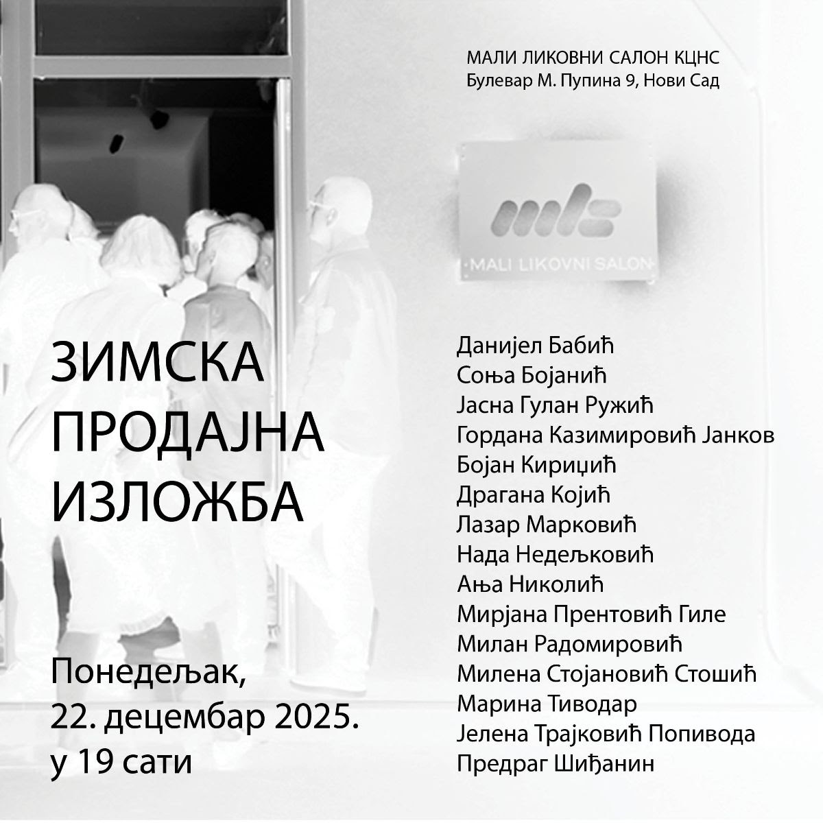 ЗИМСКА ПРОДАЈНА ИЗЛОЖБА биће отворена у понедељак 22. децембра у 19.00 часова у Малом ликовном салону. Изложба ће моћи да се погледа до 16. јануара.